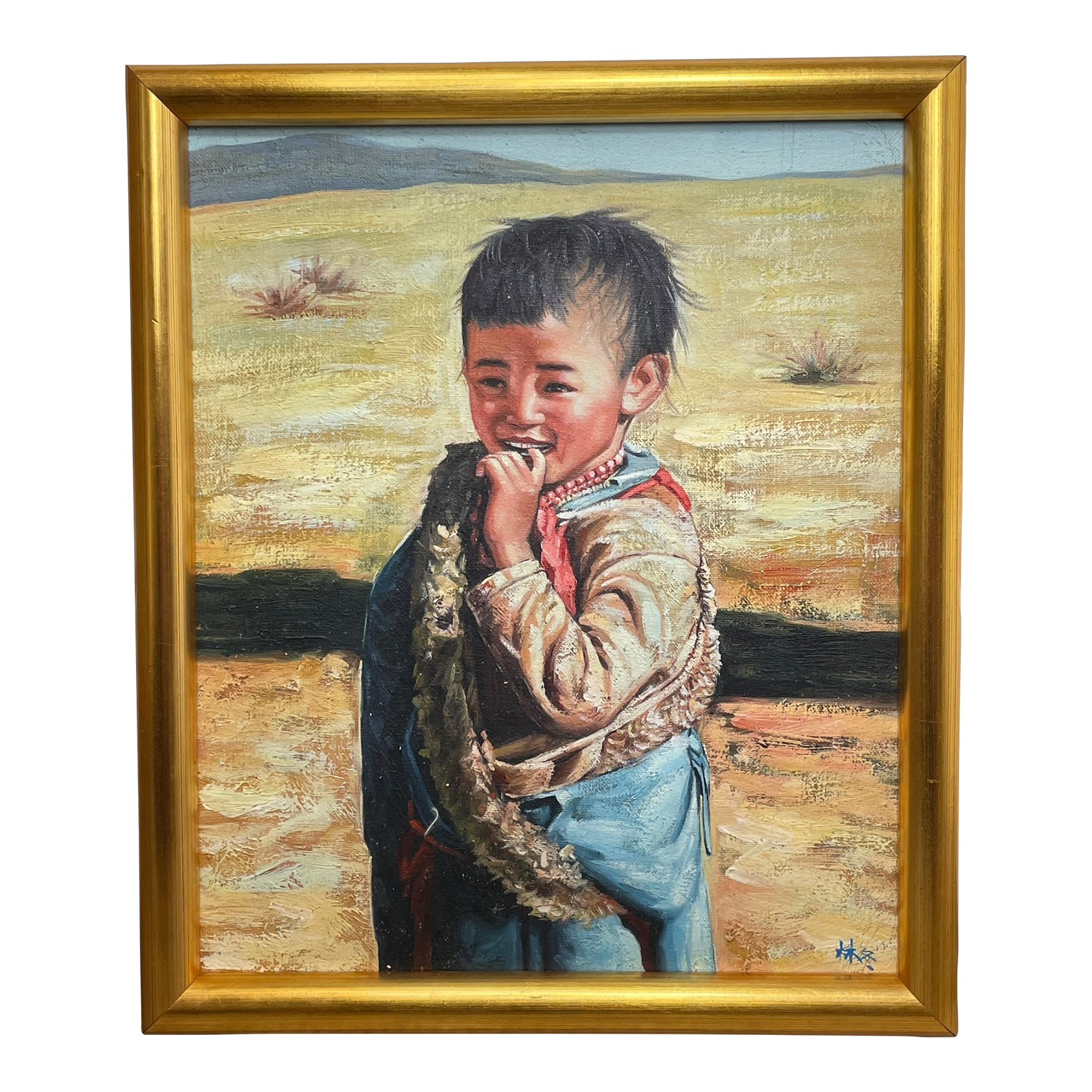 Late 20th Century Chinese Portrait Oil Painting Of A Young Boy In The Gobi Desert Framed Chairish